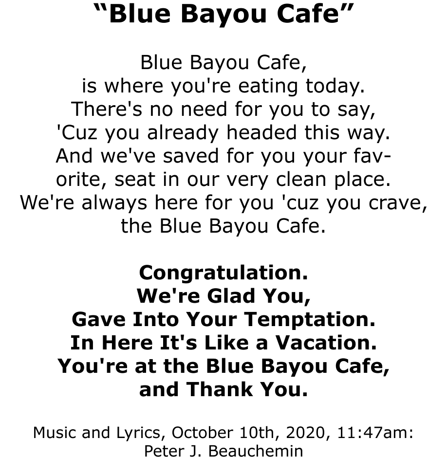 BLUE BAYOU CAFE (just East of John Ralston Rd.) 12008 East Freeway (I-10) Houston TX, 77029 (713) 453-1771